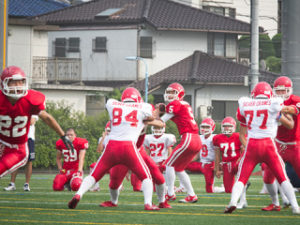 アメフトは物凄く体力を消耗するので、通常オフェンス時とデフェンス時は選手が総入れ替えになるのですが、我が校は人数が少なく「リャンメン」と言ってそのまま両方出続けざるを得ない状態でした。