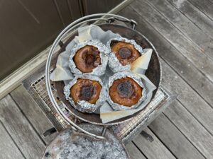 私の作る「スモークウインナー」と「スモークチーズ」は 毎回好評をいただくのですが、今回ダッチオーブンで久々に作った「アップルシナモン」(焼きりんご)は大好評をいただきました。