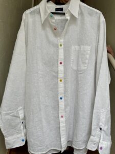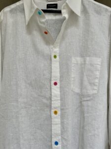 本日の日中は とても暇だったので、お気に入りの〝白シャツ〟のボタンを全て〝カラーボタン〟に付け替えました。
