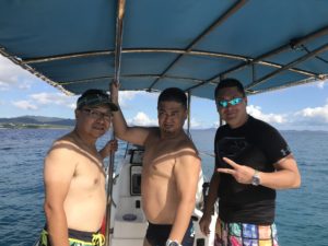 2日目はハクエーちゃんが船を出してくれたので、水納島沖まで行きスノーケリング(ダイビングは二日酔いだったので断りしました)や釣りをやって遊び、夜はハクエー邸でバーベキューをやりました。