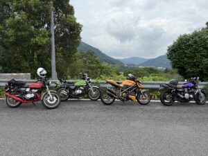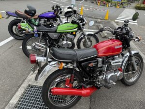 先日 ナオジの「ドゥカティ」と、ヒロシの「KH400」と、ケンタロウの「GT380」と、私の「Z1」で