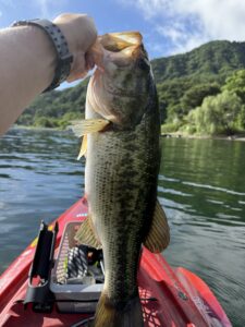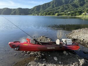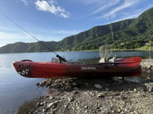 昨年の夏の終わりに このカヤックを購入したその日に、群馬県の「四万湖」で 試しにこのカヤックを浮かべてみて、その後秋に バス釣り目的で河口湖で浮かべたのですが、その時は見事にデコり(一本も釣れない)ました💧