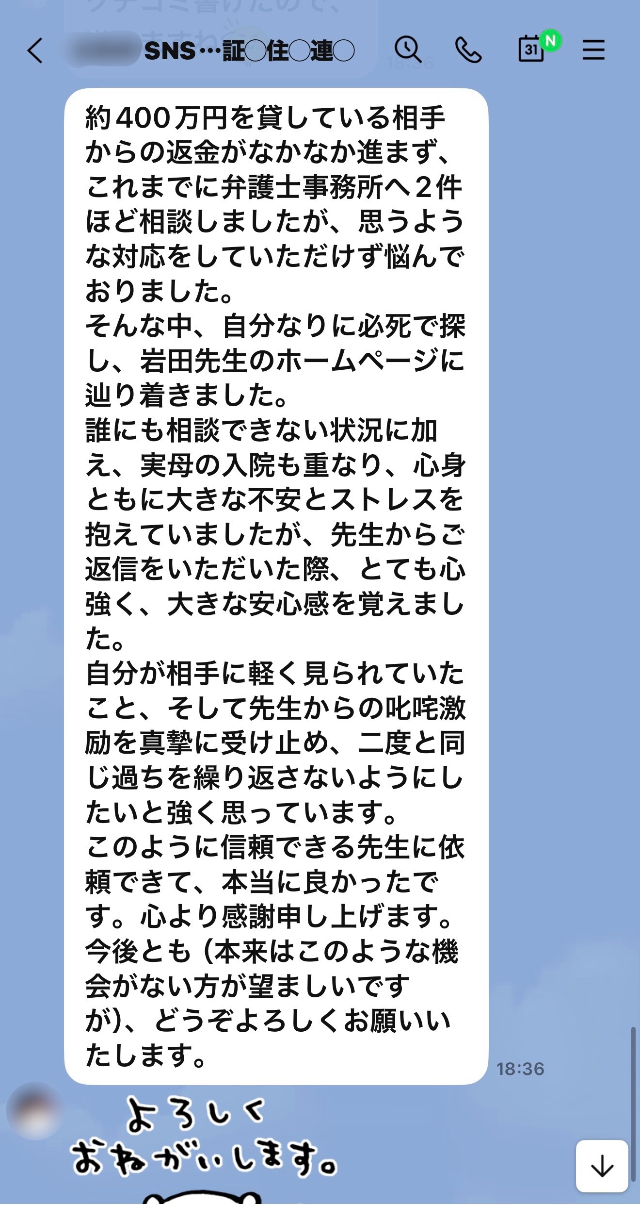 約400万円を貸している相手からの返金がなかなか進まず、これまでに弁護士事務所へ2件ほど相談しましたが、思うような対応をしていただけず悩んでおりました。 そんな中、自分なりに必死で探し、岩田先生のホームページに辿り着きました。 誰にも相談できない状況に加え、実母の入院も重なり、心身ともに大きな不安とストレスを抱えていましたが、先生からご返信をいただいた際、とても心強く、大きな安心感を覚えました。 自分が相手に軽く見られていたこと、そして先生からの叱咤激励を真摯に受け止め、二度と同じ過ちを繰り返さないようにしたいと強く思っています。 このように信頼できる先生に依頼できて、本当に良かったです。心より感謝申し上げます。 今後とも(本来はこのような機会がない方が望ましいですが)、どうぞよろしくお願いいたします。