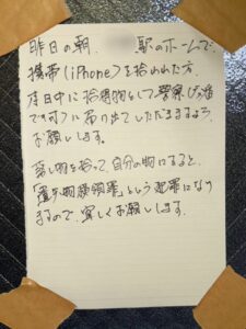 と思い、次の日の朝〝JR東日本お問い合わせセンター〟に問い合わせてもらったところ、昨夜 K駅の構内に〝落ちていた〟そうです。